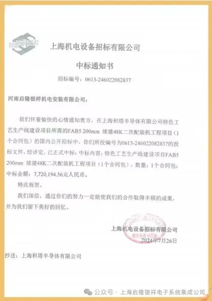 夏日炎炎事如意,中标喜讯传佳音。近日,启隆银祥凭借良好的市场信誉以及合理的报价在竞争对手中脱颖而出,成功中标上海积塔半导体有限公司特色工艺生产线建设项目。